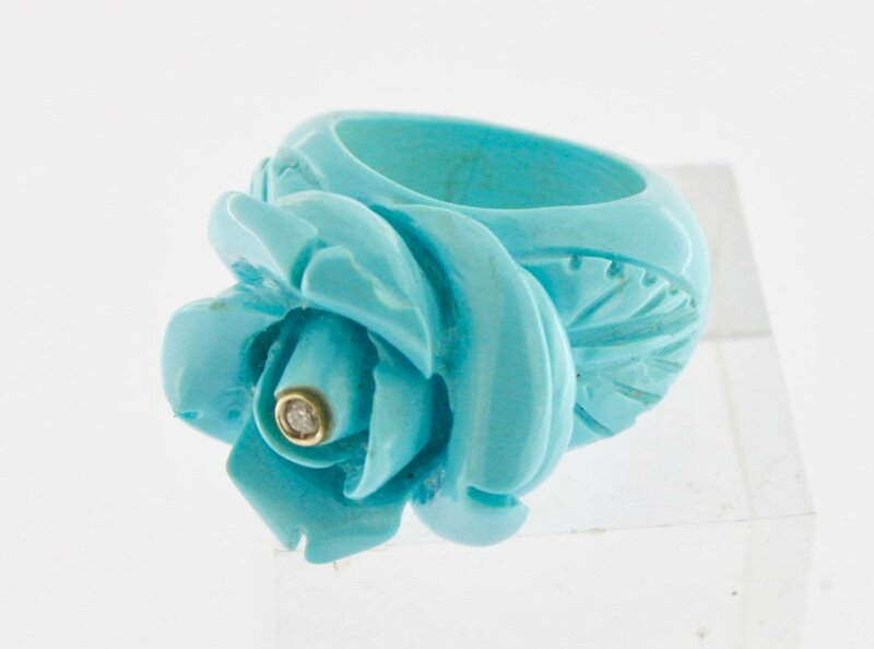Anello in pasta di turchese a forma di fiore con brillantino montato in oro bianco 18Kt.