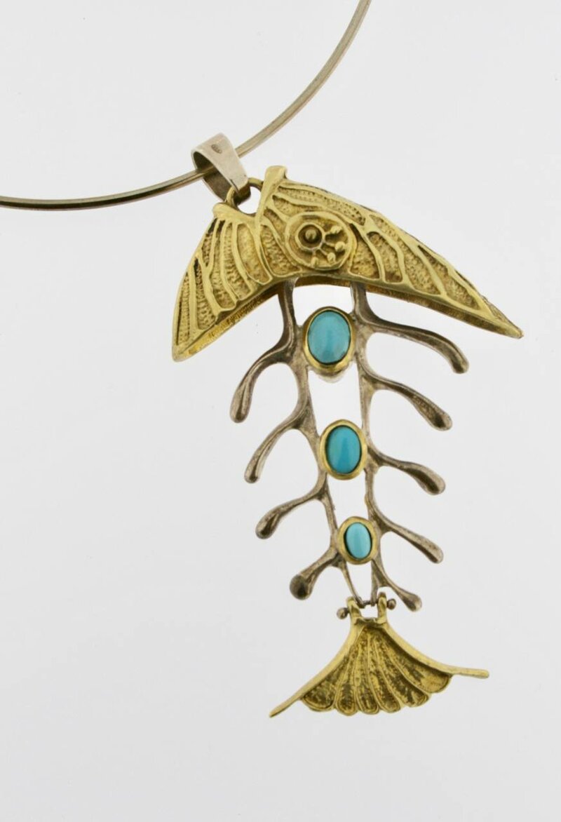 Ciondolo a forma di lisca in argento e bronzo con tre turchesi.