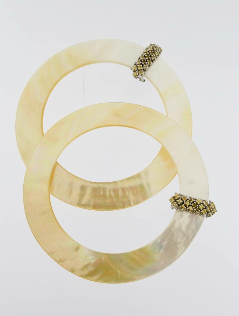 Orecchini a forma di cerchio in madreperla e oro 18 Kt fcon topazi gialli.